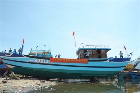 | Le navire de services logistiques et de pêche hauturière immatriculé ĐNa-90611 a été récemment mis à flot dans le port de Tho Quang de la ville de Dà Nang (Centre) |