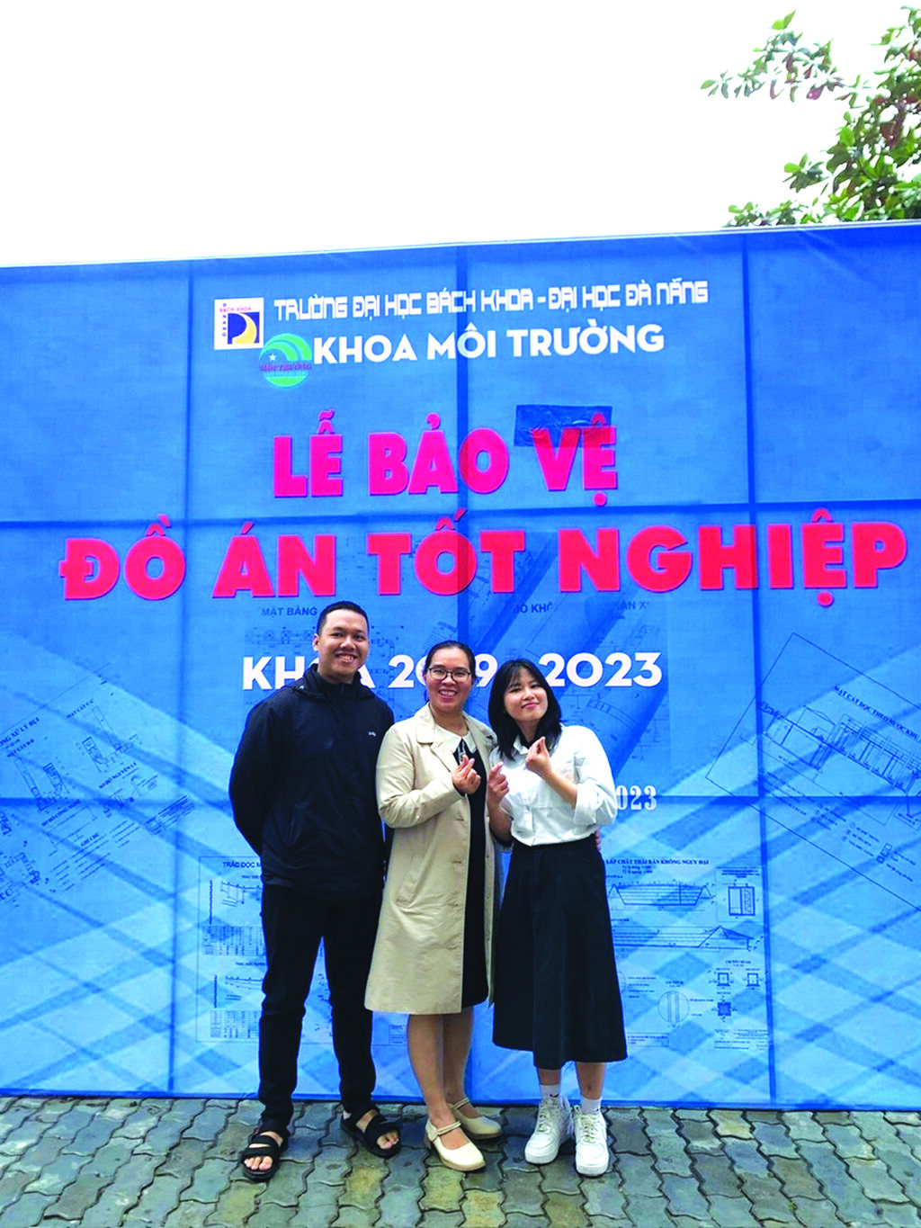 | Mme Xuân Thùy (centre) et deux de ses étudiants à la cérémonie de soutenance de leur projet de fin d’études. Photo : CTV/CVN |