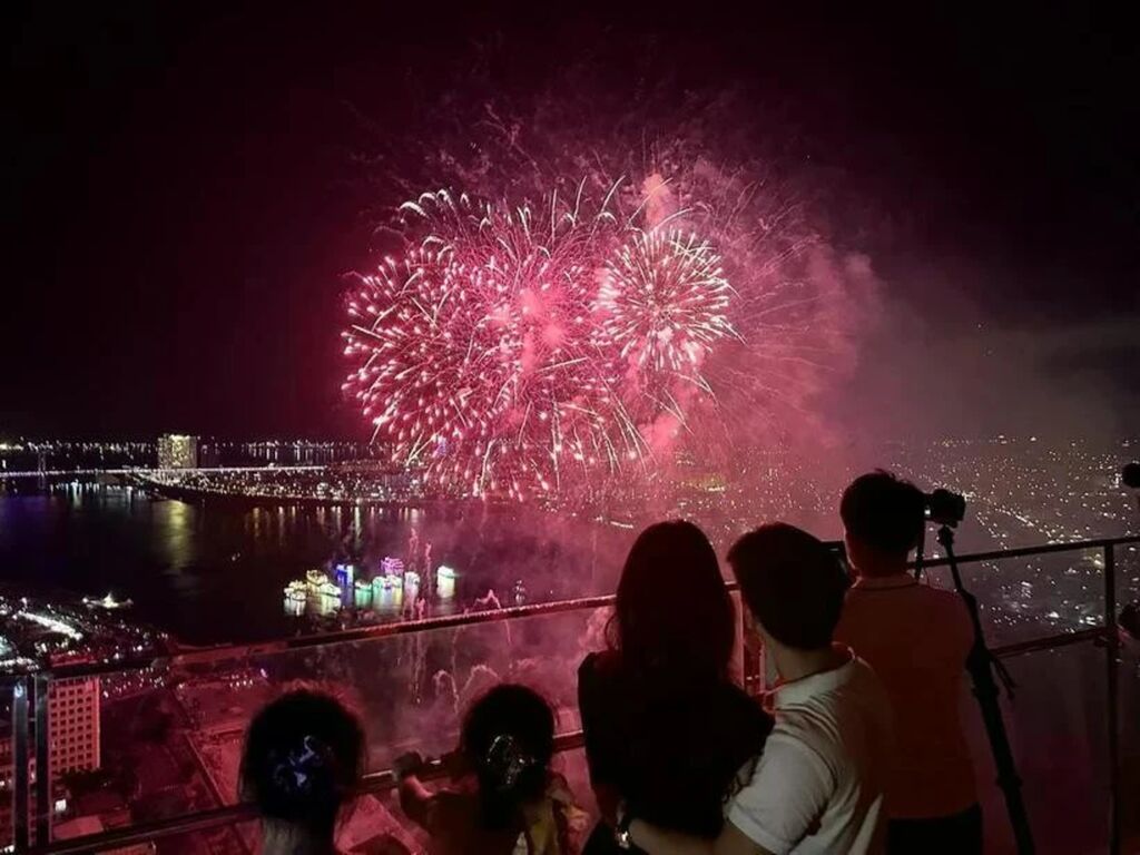 | Touristes contemplant des feux d’artifice dans la ville de Dà Nang (Centre). |