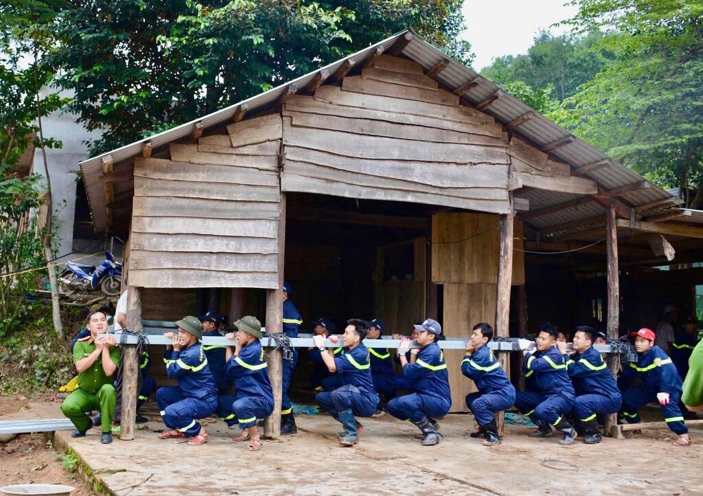 Immédiatement après la cérémonie du lancement de la "Campagne Quang Trung", des centaines d'officiers et de soldats se sont rendus dans les villages et les communes. Des équipes de travail ont rapidement contacté chaque foyer pour démonter les maisons endommagées, ériger les charpentes et les toitures selon le modèle de maison "à trois piliers" (fondations solides, murs solides, toiture solide), et transporter les matériaux dans les zones montagneuses difficiles en veillant à la sécurité et au respect des techniques appropriées.