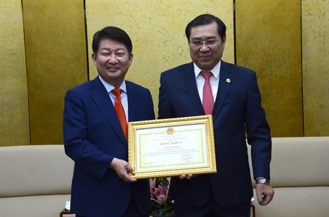 | Le président du Comité populaire de Dà Nang, Huynh Duc Tho (droite), et le maire de la ville sud-coréenne de Daegu, Kwon Young-Jin, |