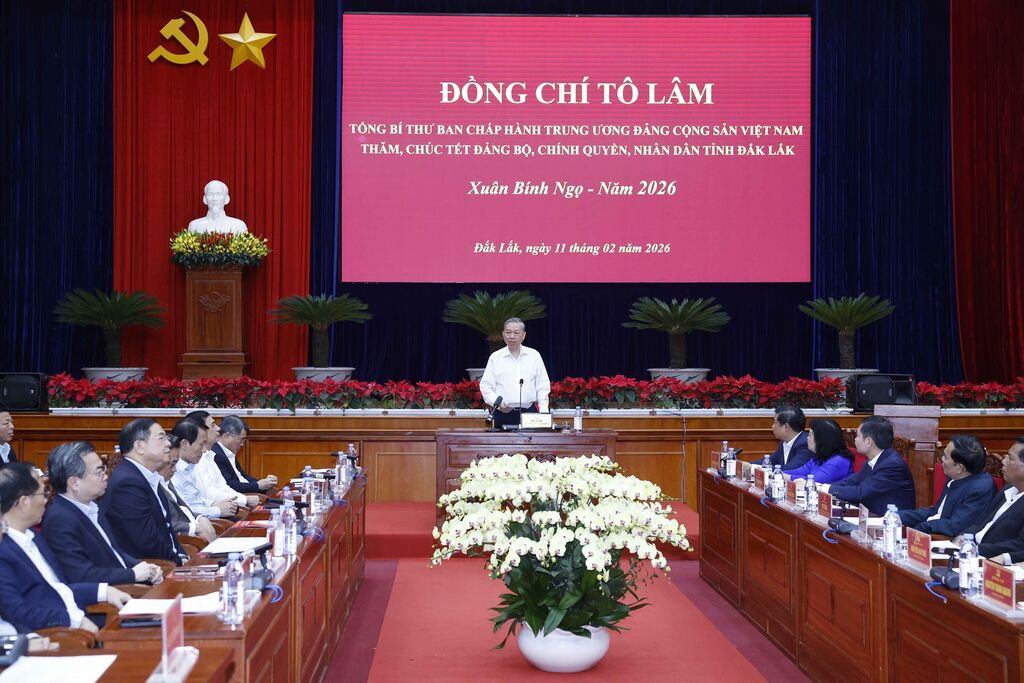 Dans l’après-midi du 11 février, le secrétaire général Tô Lâm et une mission du Comité central du Parti ont tenu une séance de travail avec l’organisation du Parti, les autorités et la population de la province de Dak Lak. La rencontre a été connectée en ligne à 102 points relais au niveau des communes et quartiers de la province.