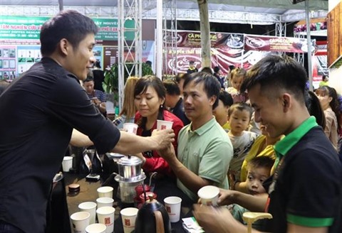 | Des visiteurs goûtent du café de producteurs participant à la deuxième Journée du café du Vietnam dans la province de Dak Nong. |
