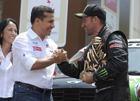 Le président du Pérou, Ollanta Humala, remet le trophée du Darkar 2012 en auto au Français Stephane Peterhansel, le 15 janvier à Lima. Photo : AFP/VNA/CVN |