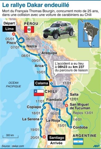 Dossard 106 sur sa moto KTM, Bourgin, 26 ans, originaire de Saint-Étienne, a percuté de plein fouet une voiture de carabiniers chiliens au km 237 du parcours de liaison qui devait le conduire au départ de la "spéciale" chronométrée, de l'autre côté de la Cordillère, en Argentine. Le dispositif médical du rallye a été immédiatement mis en oeuvre, mais les médecins urgentistes arrivés très rapidement sur place n'ont pu que constater le décès du jeune homme, dont c'était le premier Dakar.