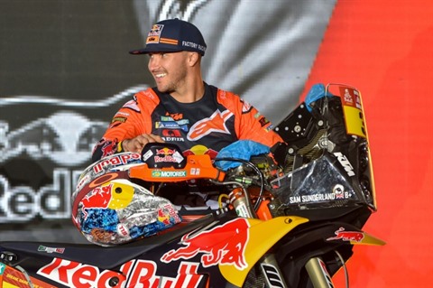 | Le motard anglais Sam Sunderland pose avec sa KTM lors de la cérémonie du podium au Dakar, le 4 janvier à Jeddah. |