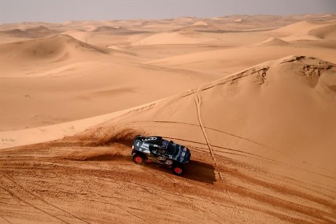 Après une première étape chaotique dimanche 2 janvier, les trois Audi hybrides ont connu une belle journée avec la troisième place de Stéphane Peterhansel à 1 min 41 et Mattias Ekström, cinquième à 2 min 59, sur cette spéciale de 255 km tracée au nord-est de l'Arabie saoudite.