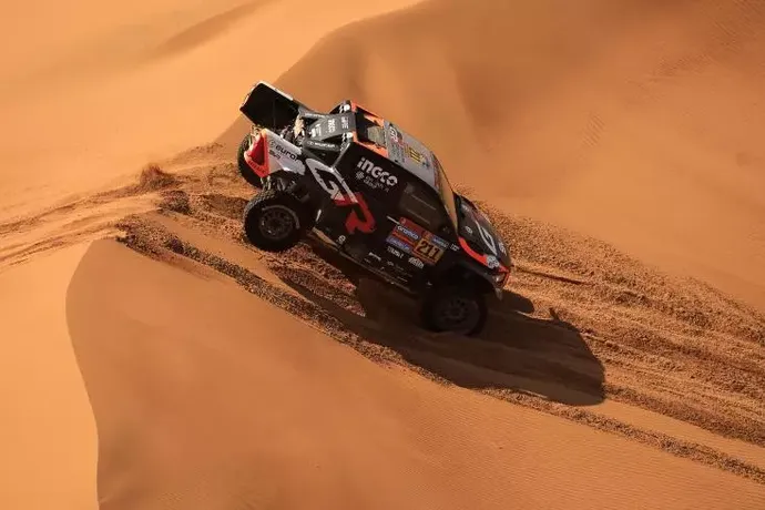 | Nasser al-Attiyah durant la 9e étape du Dakar 2025, le 14 janvier entre Ryad et Harad. |