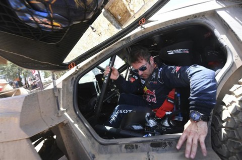 | Sebastien Loeb sort de sa Peugeot 3008 DKR à l'issue de sa victoire dans la 2e étape du Dakar à Tucuman, le 3 janvier. |