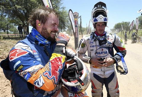 | Le motard australien Toby Price (gauche) plaisante avec Xavier De Soultrait, à l'arrivée de la 2e étape du Dakar-2017 à Tucuman, le 3 janvier. |