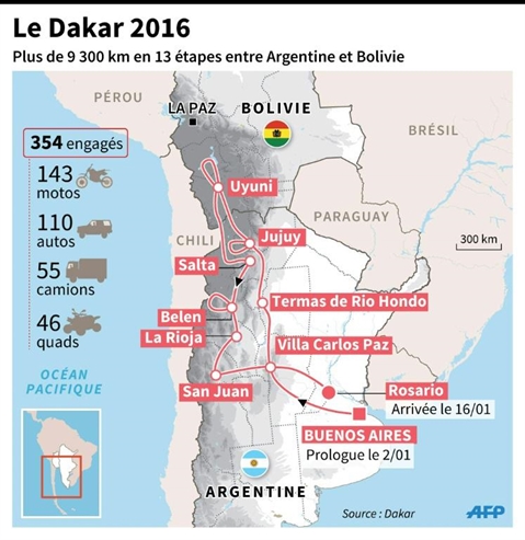 | Parcours du rallye Dakar 2016 entre Argentine et Bolivie et nombres d'engagés par catégories. |