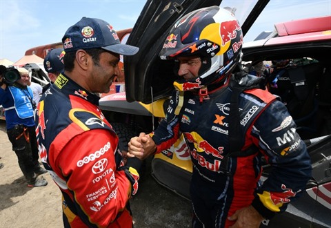 | Le Qatari Nasser Al-Attiyah (gauche), vainqueur de la 3e étape du Dakar, le 9 janvier, à Arequipa, salue Stéphane Peterhensel. |
