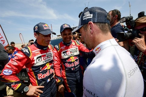 | Le Qatari Nasser al-Attiyah (Toyota), vainqueur du Dakar pour la 3e fois, à l'issue de la dernière étape entre Pisco et Lima le 17 janvier. |