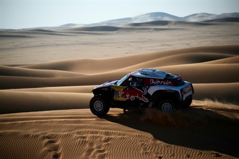 | Le pilote espagnol Carlos Sainz au volant de sa Mini engagé sur les dunes du desert saoudien près de Wadi Al Dawasir, le 12 janvier. |