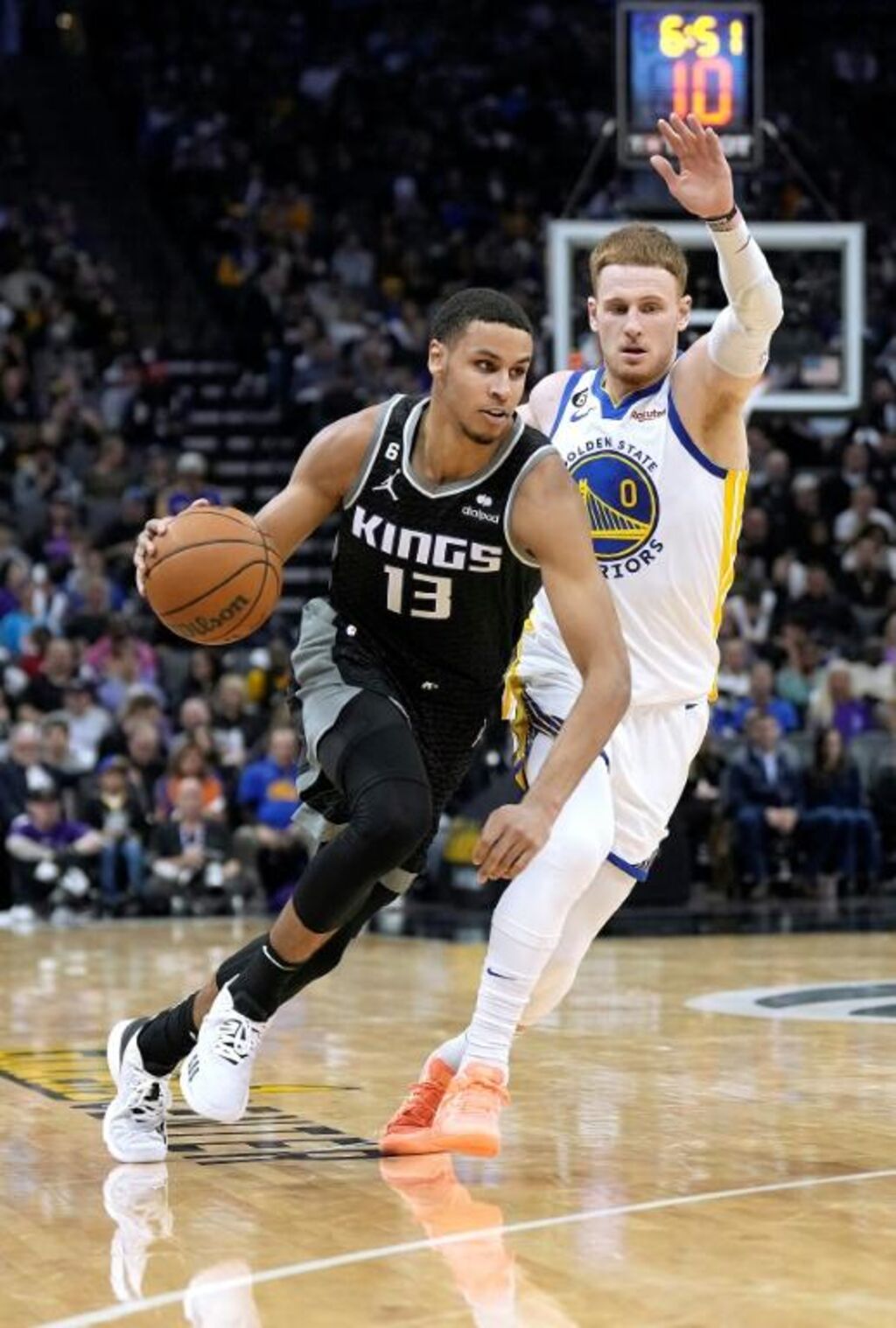 | Keegan Murray des Sacramento Lings face à Donte DiVincenzo des Golden State Warriors le 7 avril à Sacramento. |