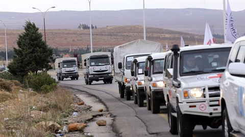 | Convoi humanitaire de la Croix Rouge internationale au départ de Damas, le 11 janvier. |