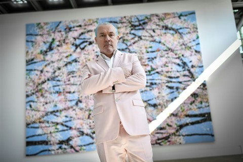 | L'artiste britannique Damien Hirst pose lors de la conférence de presse pour présenter "Cerisiers en fleurs" à la Fondation Cartier, à Paris le 2 juillet. |