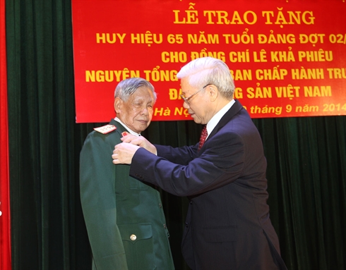| Le secrétaire général du CC du PCV et secrétaire de la Commission militaire centrale, Nguyên Phu Trong (droite), a attribué l'Insigne des "65 ans de membre du Parti" à l'ancien secrétaire général du CC du PCV, également ancien responsable du Département général de politique de l'Armée populaire du Vietnam, Lê Kha Phiêu. |