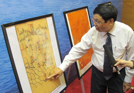 | Le maître de recherche-Docteur Trinh Khac Manh présente une carte ancienne affirmant la souveraineté du Vietnam sur les deux archipels de Hoàng Sa et Truong Sa. |