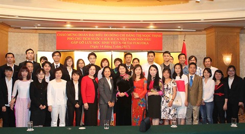 | Dang Thi Ngoc Thinh (1er plan, en ao dài noir) rencontre des étudiants vietnamiens à Fukuoka, le 14 mai au Japon. |