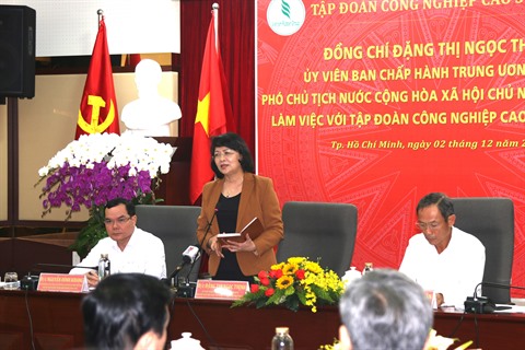 | La vice-présidente de la République, Dang Thi Ngoc Thinh, prend la parole lors d’une séance de rencontre avec les dirigeants du Groupe du caoutchouc du Vietnam, le 2 décembre à Hô Chi Minh-Ville. |