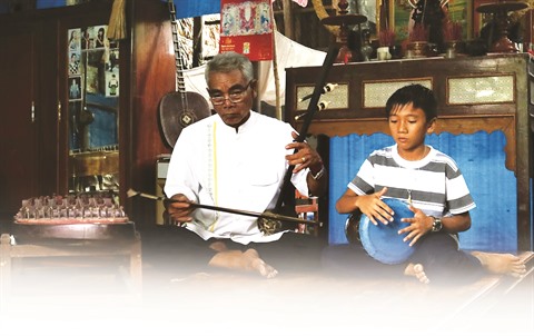 | M. Râm apprend à son petit-fils, Danh Sa Linh, à jouer d’instruments de l’ethnie khmère. |
