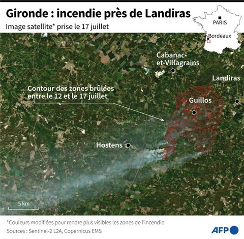 | Image satellite montrant les zones brûlées entre le 12 et le 17 juillet par l'incendie qui sévit dans le secteur de Landiras, en Gironde. |