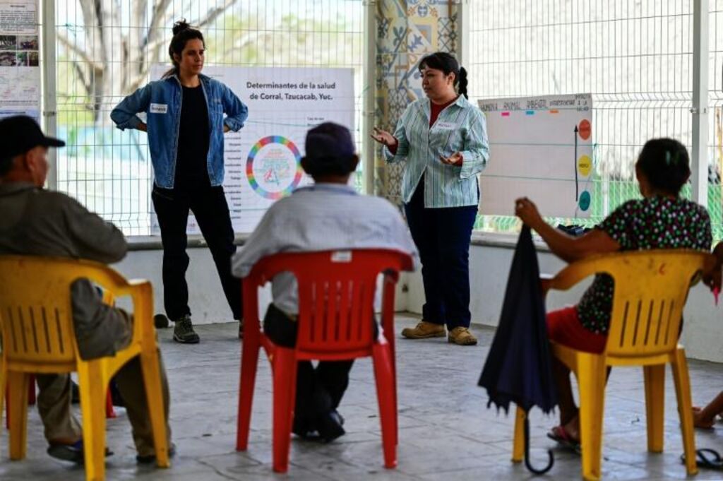 | Deux chercheuses expliquent à des habitants le but des études de prévention des zoonoses, le 29 mars à Tzucacab, au Mexique. |
