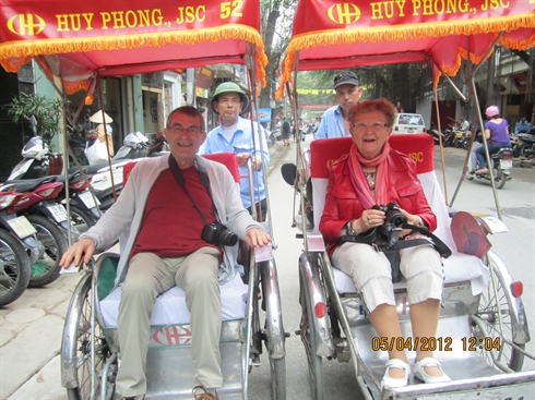 La prise de contact avec Hanoi est un choc. Notre premier guide nous place d’emblée dans la circulation sur des cyclopousses. Les deux- roues à moteur ont remplacé en grande partie les vélos, et c’est dans une circulation intense, qui dure sans discontinuer du lever du jour à la pleine nuit, que nous découvrons les rues bordées de hautes maisons étroites (appelées maisons-tubes), les trottoirs où s’activent vendeuses de fruits et légumes, femmes portant leurs palanches lourdement chargées, ou proposant à même le sol la petite restauration. Quelques maisons coloniales prennent un peu plus d’espace. Les étudiantes à bicyclette portent de belles tenues blanches vaporeuses, l’ao dài (tunique fendue traditionnelle des femmes vietnamiennes). Les classes se font par demi-journée, faute de locaux : la belle jeunesse vietnamienne est si nombreuse !