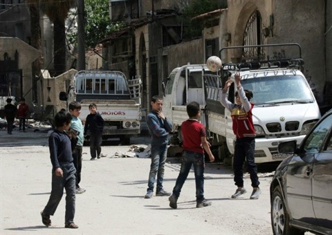 | Des enfants syriens jouent au foot dans une rue de l'ex-ville opposante de Zamalka, dans la Ghouta orientale, le 11 avril. |