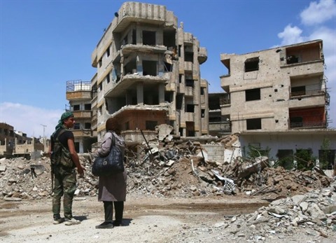 | Un combattant prorégime parle à une femme qui cherche sa maison dans un quartier détruit de l'ancienne ville opposante de Zamalka, dans la Ghouta orientale, près de Damas, le 11 avril. |