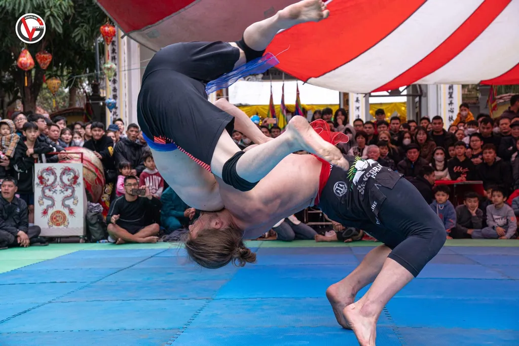 | Le Biélorusse Zakhar Dzmitrychenka (gauche) lors de la fête de lutte traditionnelle du village de Triêu Khuc, Hanoï. |