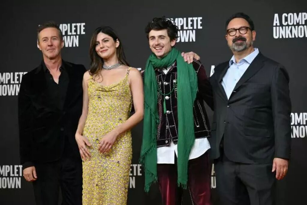 | De gauche à droite : Edward Norton, Monica Barbaro, Timothée Chalamet et James Mangold lors de la première italienne du film "A Complete Unknown", le 17 janvier à Rome. |