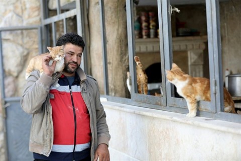 Cet homme de 43 ans qui a grandi à Alep, la deuxième ville du pays, était électricien avant le début de la guerre en 2011. Il raconte qu'il se rendait alors chaque jour auprès des bouchers pour récupérer des restes de viande qu'il distribuait aux chats du quartier.