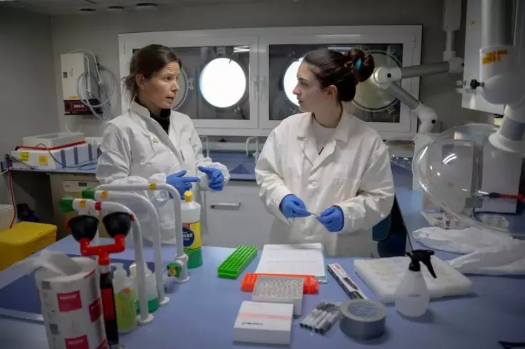 | Les toxicologues belge Laura Pirard (droite) et finlandaise Heli Routti dans un laboratoire à bord du brise-glace de recherche "Kronprins Haakon" dans l'est du Spitzberg, dans l'archipel du Svalbard, le 6 avril. |