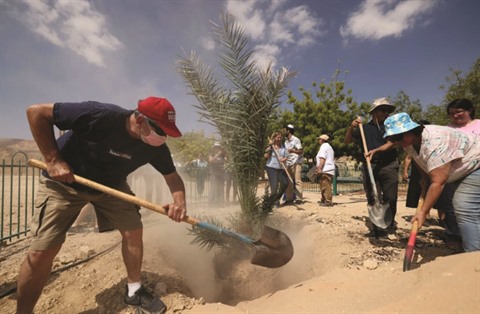 | Des Israéliens plantent un dattier issu de graines vieilles de 2.000 ans, dans le Sud d’Israël. |