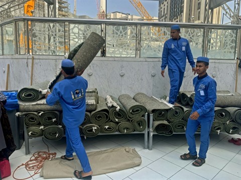 | Des équipes de nettoyage empilent des tapis de prière à la Grande mosquée de La Mecque en Arabie saoudite, le 28 février. |