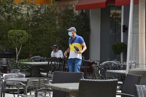 | Un homme avec un masque de protection devant un café à Ryad, en Arabie saoudite, le 15 mars. |