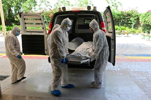 | Des employés d'un crématorium incinèrent une victime du nouveau coronavirus, à Dubaï, aux Émirats arabes unis, le 19 avril. |