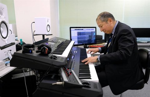 | Le compositeur Minoru Mukaiya sur son piano, à son domicile de Tokyo, le 1er mars. |