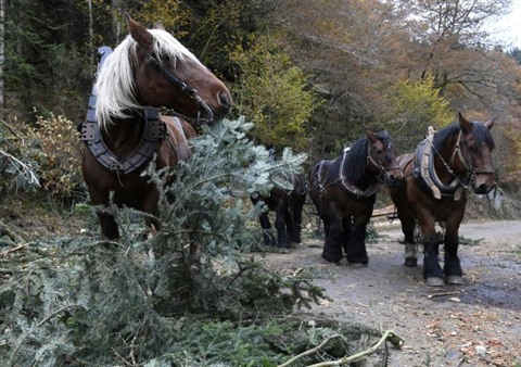 | Un cheval tire un sapin dans le Parc National de Morvan, près de Roussillon-en-Morvan, en France, le 2 novembre 2016. |