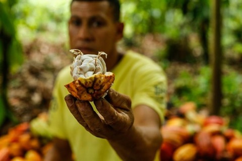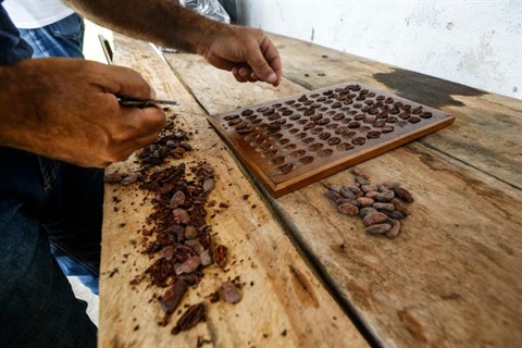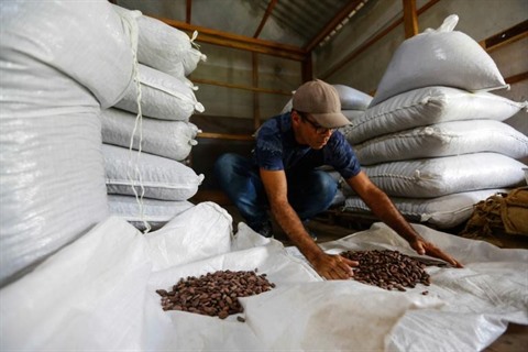 | Le technicien agricole Flavio Jose trie les fèves de cacao sèches pour les évaluer dans la ferme Sagarama à Coaraci, au Nord-Est du Brésil, le 12 décembre. |