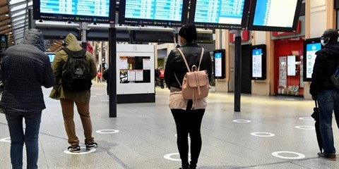 | Des passagers sur les quais à la gare Montparnasse à Paris, le 12 mai suivent les marquages au sol de distanciation sociale. |