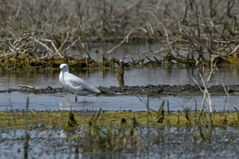 | Une mouette aperçue dans un marais pollué par le déversement d'eaux usées dans la région de Chibayich, correspondant au "jardin d'Eden" mésopotamien, dans le Sud de l'Irak, le 14 avril. |