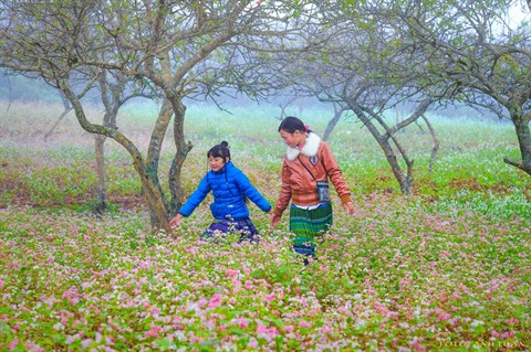 | Deux filles H’Mông s’amusent dans un champ de sarrasin en fleurs au printemps sur le plateau de Môc Châu. |