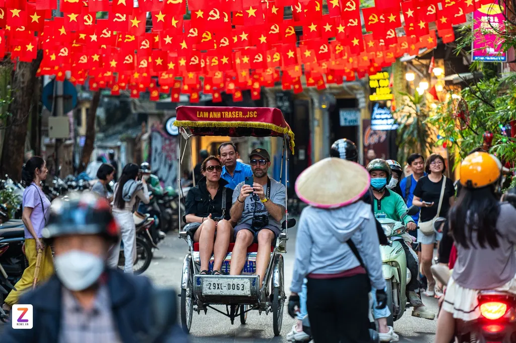 | Des touristes internationaux découvrent le Vieux Quartier de Hanoï à bord d’un cyclo-pousse. |