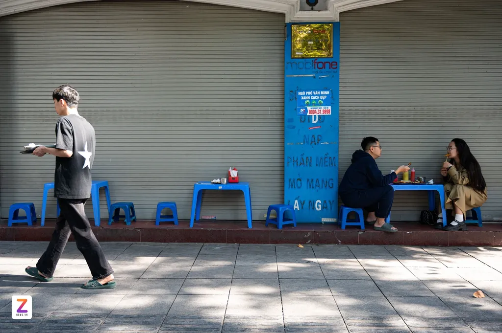 | Des habitants installés sur de petits tabourets en plastique dégustent des plats de rue sur la rue Quang Trung, arrondissement de Hoàn Kiếm. . |