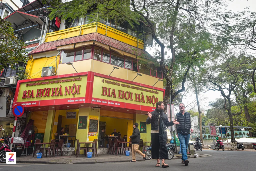 | Des visiteurs étrangers devant un établissement de bia hơi sur la rue Quan Thanh, arrondissement de Ba Dinh, à Hanoï. |