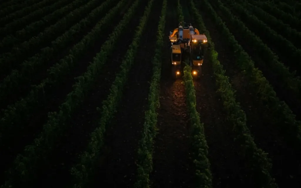 | Une machine vendange des rangs de souvignier gris pour la cave coopérative Tutiac dans les vignobles de Civrac-de-Blaye, dans la région de Bordeaux, le 3 septembre. |