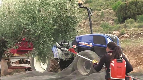 César Tarradas est l’un des nouveaux habitants d’Oliete, où il s’est installé il y a quelques mois avec sa famille. Sur un terrain aride et caillouteux, il secoue à l’aide d’une machine les branches d’un arbre pour en faire tomber les olives sur des filets tendus au sol.